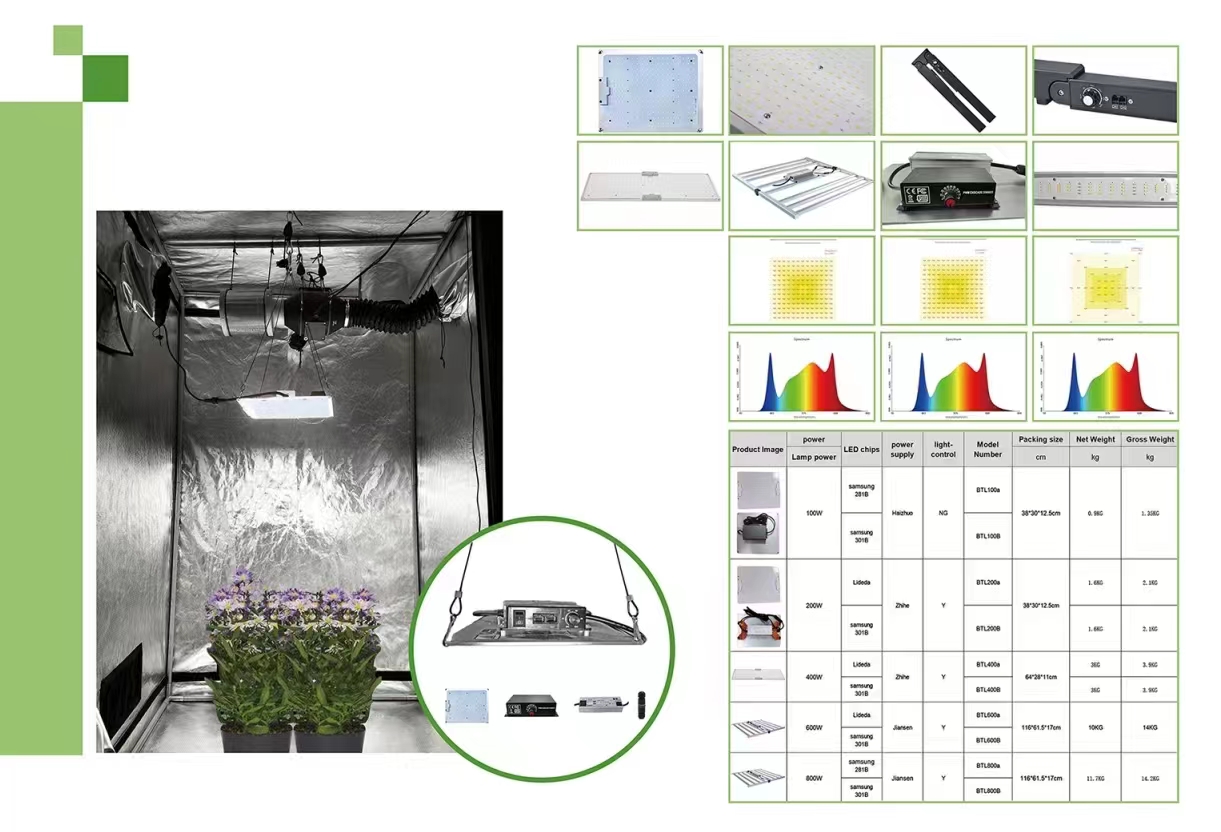 Use Samsung LM301B diodes; full spectrumlight ideal for all stages of growth; protective coating on LEDs helps extendthe lifespan; no fan, zero noise. Only consumes 100w, running 50% less powerthan other Blurple lamps or HPS. This light delivers a powerful light outputand uniform canopy penetration resulting in maximum yields.